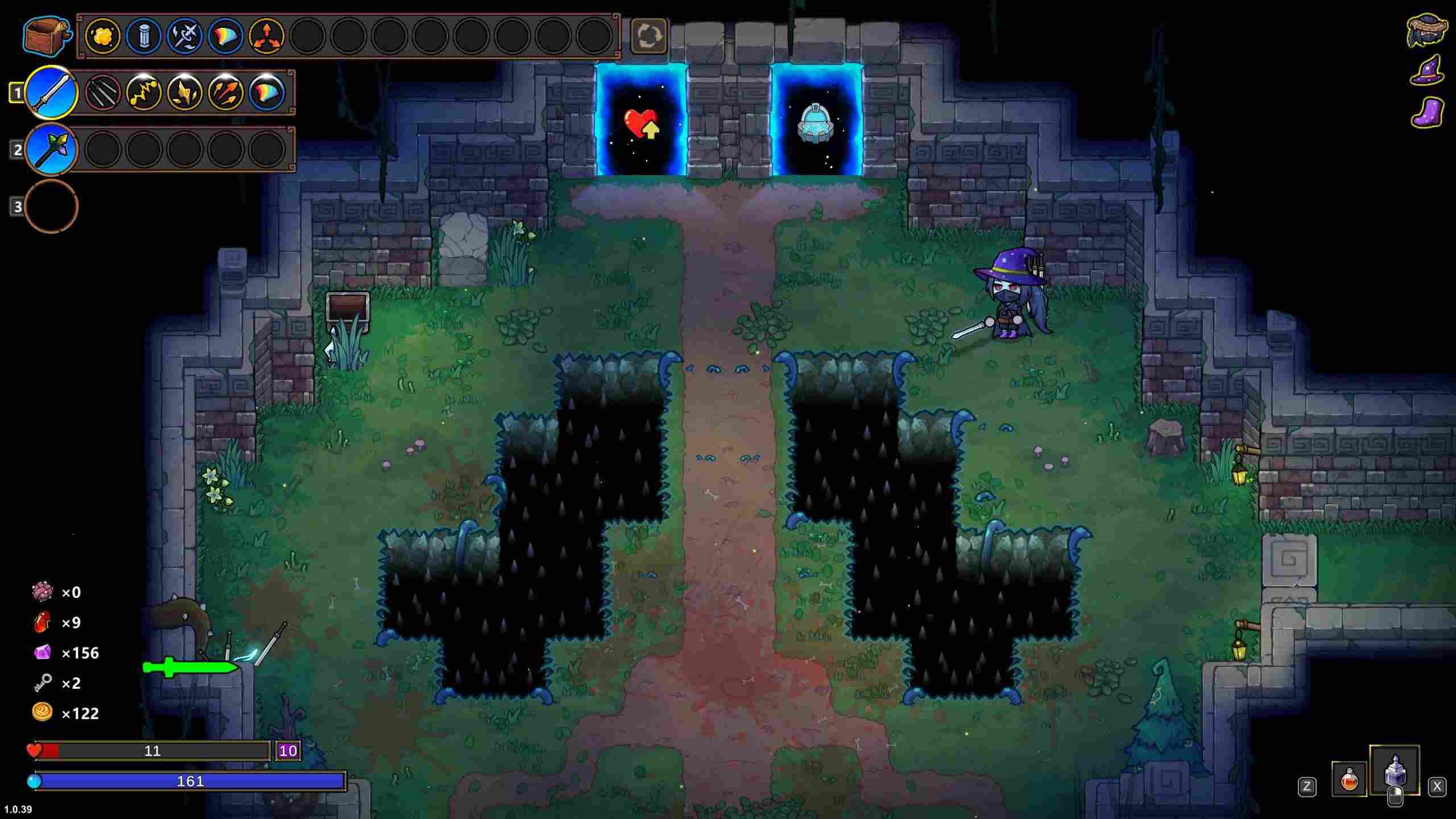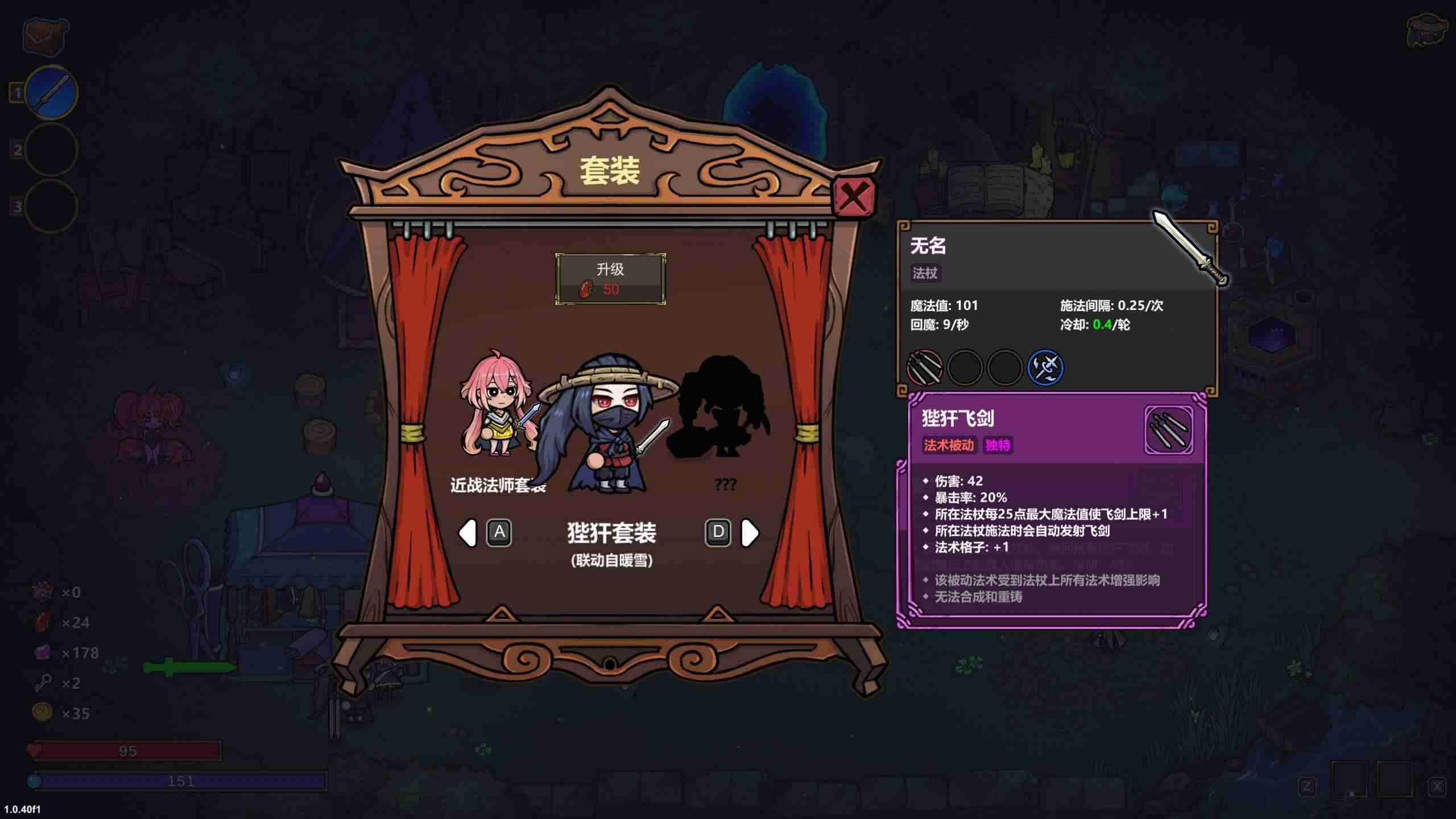 一方面,飞剑不占用格子,享受所有强化的同时,会在对应法杖施法的时候追加一把飞剑射出。另一方面,飞剑的数量依赖于魔力上限的特性使得法杖的规划被被大量简化。于是,在具有此初始物品的时候,构筑可以相对脱离法杖和法术的设计,反而具有了较大的通用性,即围绕飞剑输出进行构筑。