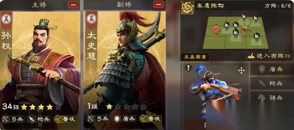 由孙权加太史慈,搭配车悬阵和武射吏组成,通过普攻伤害输出,配合武将提供的暴击,爆发仅次于暴击骑。在野战合围和追击等场景,以及主动进攻的时候都非常好用。主要克制反击枪,然后被技能骑和异常盾克制,野战的时候注意操作。天赋加点的话,优先点穿透和普攻暴击相关的效果。技能升级主3,次2,4,最后加1。武将加点追求稳定输出主加武力,追求爆发输出的话,推荐主加灵巧。等到中后期甘宁限定卡池出来后,太史慈可以换甘宁。同时平民则甘宁加太史慈,强度也是非常不错的,而且相比于孙权加太史慈这队,甘宁加太史慈更容易觉醒。