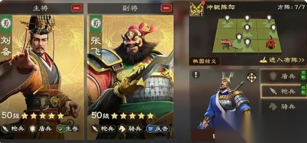 由刘备加张飞,搭配冲轭阵和白毦兵组成,通过持续反击,对所有普攻自己的部队造成伤害,野外前排肉盾,通过队伍的反击和回复,适合以少打多,是车头大佬,兵源充足,野战刷战功的不二之选。主要克制技能骑和控制骑,然后被普射攻克制,野战遇到尽量避其锋芒。天赋加点的话,选择增加反击率的和增加防御的天赋。技能升级,优先升级提升反击率、反击增伤和增加防御的技能,刘备则优先升级提高回复效果的,升级顺序主3次4,2,最后加1。武将加点的话,想要伤害高一些,就主加武力,想要抗伤能力更强,就主加统御。或者两个都加一点也可以。在前期张飞小卡池没出来的时候,张飞可以用关羽和夏侯惇替代,推荐夏侯惇,因为前期夏侯惇碎片多。平民的话就推荐关羽和夏侯惇,这两个武将也容易觉醒。