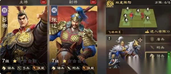 由吕布加张辽,搭配双龙阵和禁军组成。通过高频发动技能,触发暴击,瞬间造成爆发伤害为主。适合在野战的时候主动进攻和追击使用。主要克制普射弓和异常盾,跑后被反击枪克制,野战进场的时候注意把技能丢给普射弓和异常盾。天赋加点,优先点主将抗震率(吕布)和技能暴击相关的效果。技能升级则优先1,3技技能,其次是4,2,毕竟队伍主打的就是技能暴伤和免控。武将加点,想要输出稳定一点,就主加武力,追求极致爆发就主要灵巧。前期张辽限时卡包没上线前,可以用赵云替代张辽,然后平民则推荐张辽搭配赵云,也是因为相比于吕布,赵云更容易觉醒。
