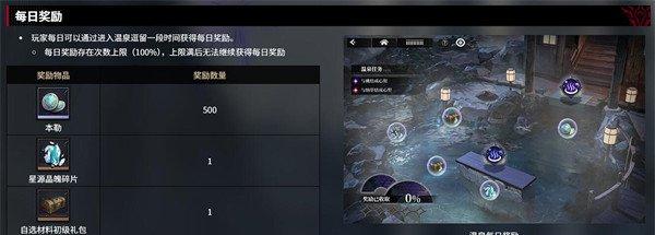 温泉系统的基础功能是提供稳定的资源获取渠道。玩家每日进入温泉并停留3分钟即可领取100%的奖励,包括本勒、星源晶魄碎片、自选材料初级礼盒和小型星魂精髓等实用道具。