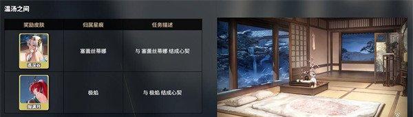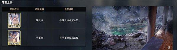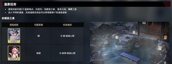 温泉系统中包含三大特色温泉地点:米提亚之泉、温汤之间和薄雾之泉,每个温泉对应不同的星痕角色及任务要求。例如,米提亚之泉与桃、纳菲相关,玩家需与她们缔结心契才能解锁含玉钩和魔王请帖皮肤。心契解锁流程分为两个阶段:首先需通过战斗协同或赠送礼物(如七色铃兰、千纸鹤)将星痕好感度提升至5级,随后在温泉场景中触发专属剧情,选择正确对话选项即可完成心契。解锁的皮肤可在星痕-外观界面自由切换,部分皮肤还能提供战斗中的属性加成。