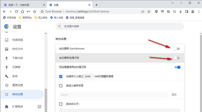 4、然后找到右侧中的"自动更新Center Browser"以及"自动更新后提示我",最后将其开关按钮关闭就可以了。