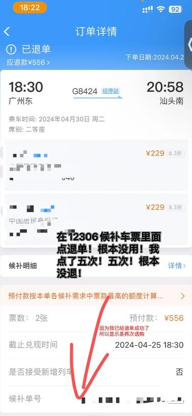 近日有小伙伴称在12306候补车票里面点退单! 根本没用!我点了五次! 五次! 根本没退!