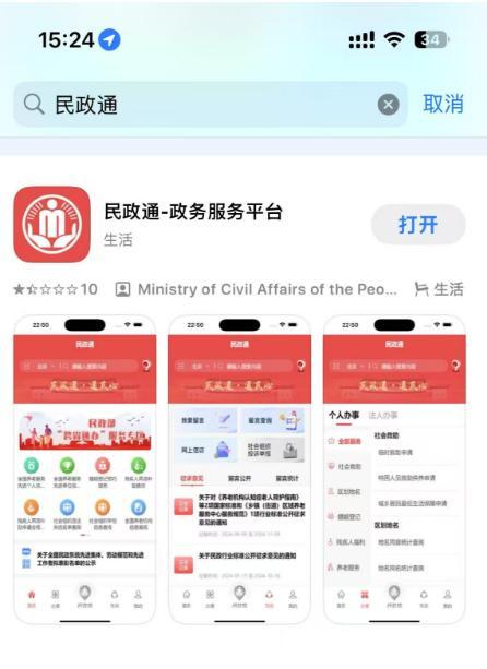 如果您使用的是智能手机,可以在手机的应用商店中,搜索 “民政通”,然后点击下载并安装。对于不太熟悉手机操作的老年人,建议让子女或身边熟悉手机操作的人帮忙完成这一步骤。安装完成后,在手机桌面会出现 “民政通” 的应用图标。