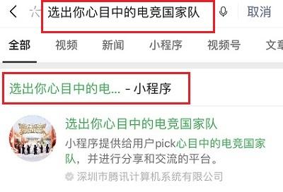 1、首先玩家们打开自己的微信,然后在上方的搜索栏搜索【选出你心目中的国家电竞队】并点击进入;