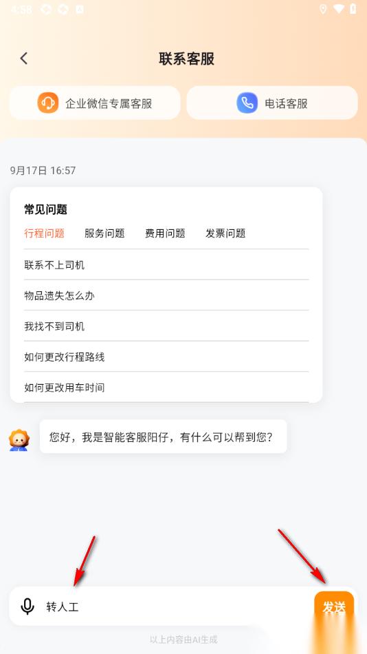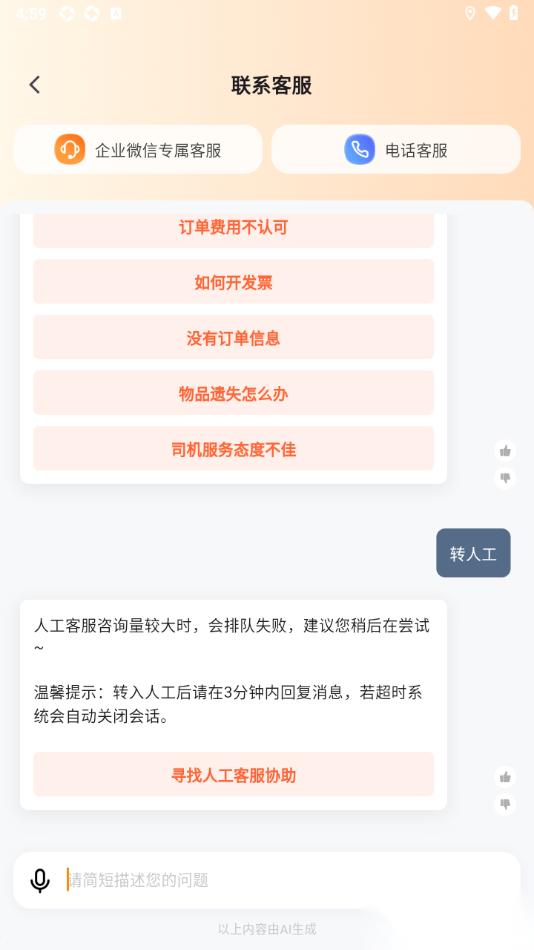 阳光出行app是一款用户远出时可以使用到的出行工具,可以通过该软件打出租车、顺风车等,在该软件中预订车辆后,会有相应的行程订单保存下来,不管是否完成了行程订单,都会记录订单成功或者是失败的历史记录,一些用户想要通过人工服务查看某一个异常订单,看看该异常订单出现的具体问题,那么该如何转人工服务查询问题呢,一般情况下进入到联系客服中会自动通过智能客服回答用户的问题,那么用户可以输入转人工消息,会为用户推送出转人工的提示内容,按照要求操作即可,快来和一起看看步骤吧。