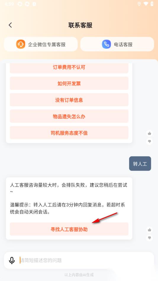 4.之后会在页面上弹出一个提示内容,选择【寻找人工客服协助】选项即可完成设置。