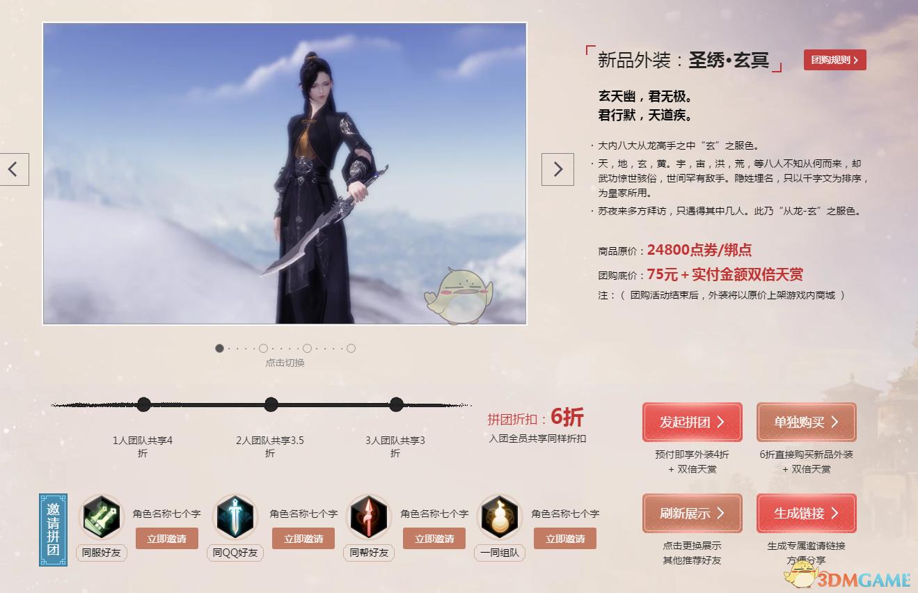 新品团购时间:2018年12月27日–2019年1月6日24时,玩家可选择“发起拼团”,也可直接“参与拼团”,凑齐3人即底价开团。