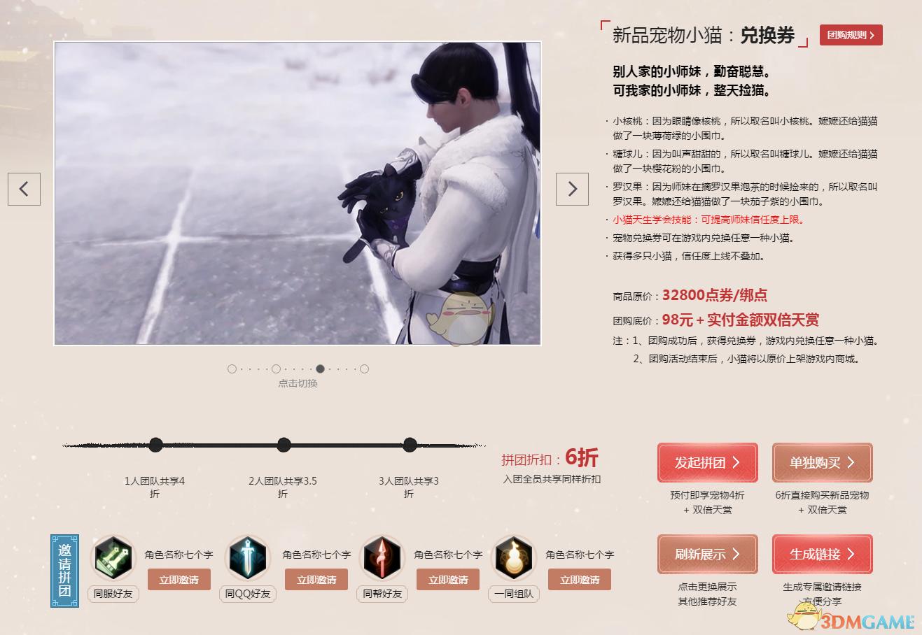 注:1、团购成功后,获得宠物兑换券,游戏内选择小猫。2、团购活动结束后,小猫将以原价上架游戏内商城。