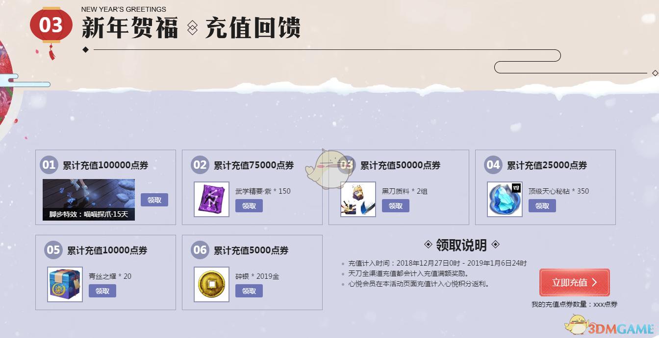 充值计入时间:2018年12月27日0时 - 2019年1月6日24时。天刀全渠道充值都会计入充值满额奖励。心悦会员在本活动页面充值计入心悦积分返利。