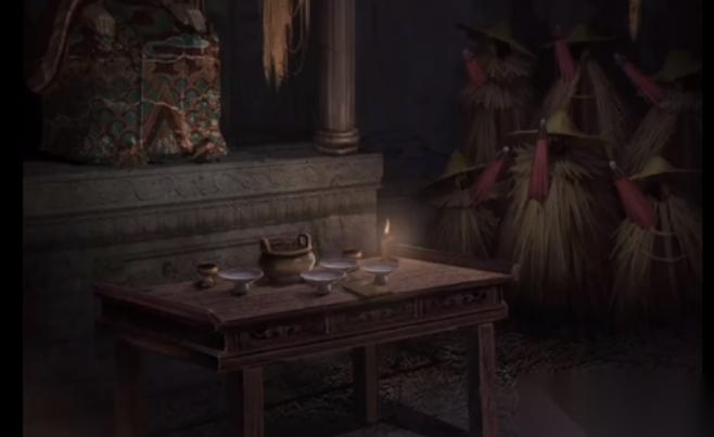 点击神像前方的供桌,查阅桌面上的古书,得到北边的水碟子中放入鱼,南边的火碟子中放入烤牛肉干,西边的金碟子中放入元宝,东边的木碟子之中放入竹叶包着的粽子。最后把先前吗,买来的益昌特产礼盒放在桌面上,东西全部摆放完毕,点击神像,把神像的嘴巴打开,拿到嘴巴里面被缠着红线的转运盘。把转运盘上面缠绕着的红绳给拆下来,得到红绳。退出小庙,再次来到黑白无常的这边,拿出锣棒连续敲打四次白无常手中的锣,将时间切换成为二更天。当打完更后,黑白无常燃烧起来化为灰烬,后续将无法打更,这也是最后一次打更。
